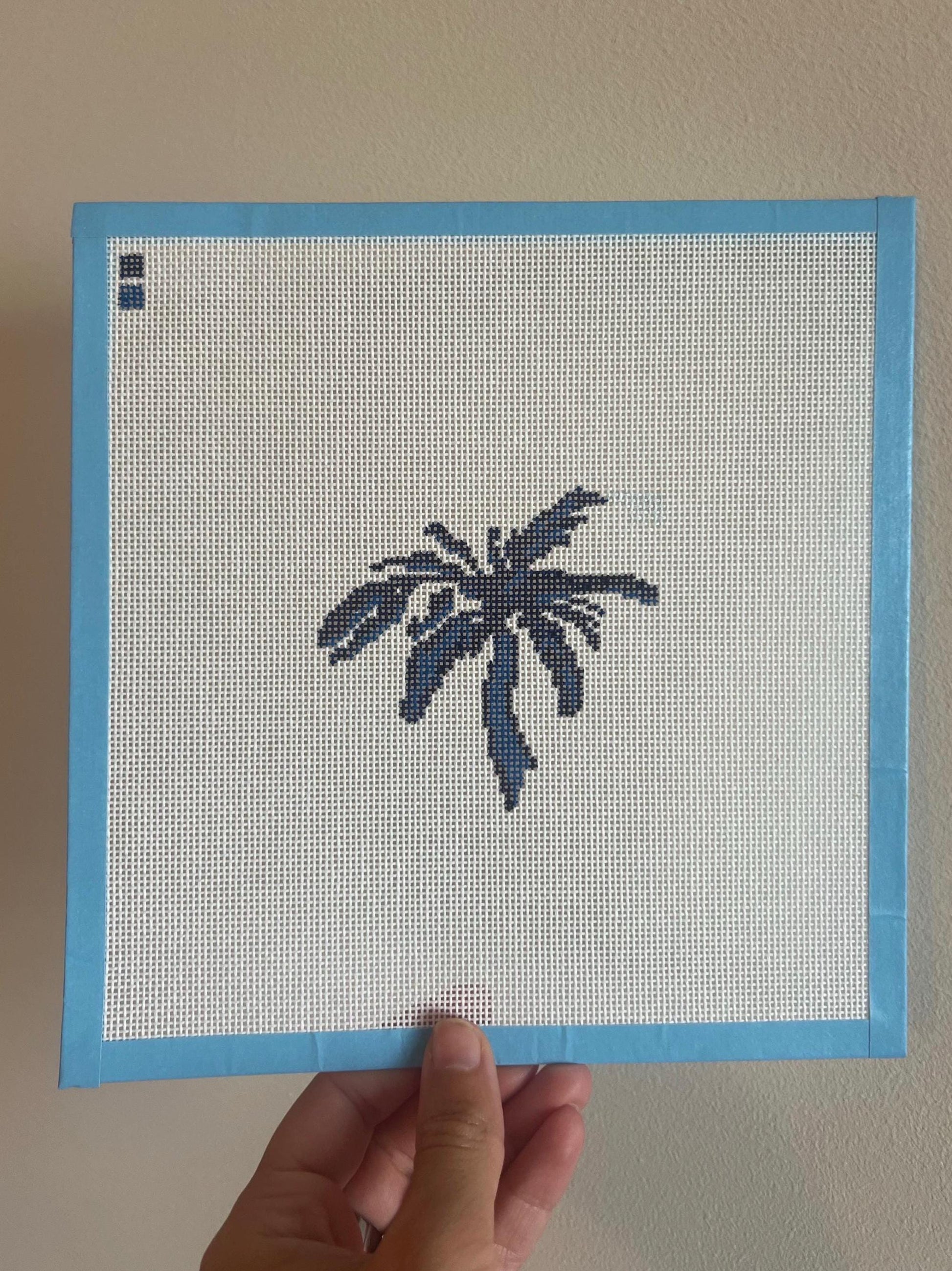 Stitch up a little slice of paradise with this digital palm tree needlepoint chart. Designed in a grandmillennial, coastal palette of blue hues, this 4" round is perfect for relaxing projects, summer gifts, or beach house décor. This is part of the Blue Skies & Backside series including three additional charts that are available as a four chart bundle.